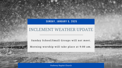 Sunday, January 5, 2025: Sunday school and small groups are cancelled, and our worship service will take place earlier in the morning at 9:00am. We hope this will allow you to attend, but as always, please use your discretion before driving.